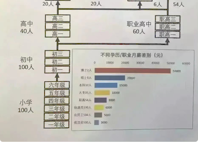 看完不同学历毕业生月薪差别的图就知道了,中考对于学生真的很重要,中考完全是个分水岭的存在,经过中考之后这100名学生就被分出不同的层次了。