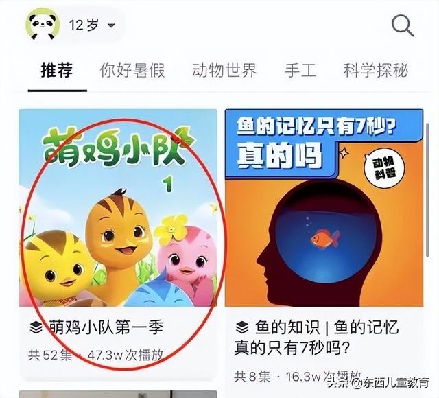 但是分龄内容还是有问题。和腾讯正好相反,它的小龄段我觉得没啥问题,大龄段有些时候显得有些幼稚。比如,为啥会给12岁孩子推荐《萌鸡小队》啊???
