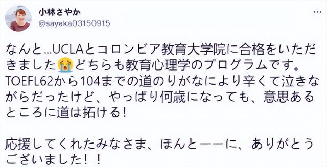 就在最近,原型纱耶香公开喜讯:34岁的她考上哥伦比亚研究生,梦想帮助更多人。