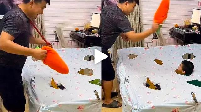 因为儿子特别喜欢玩电玩城的打地鼠游戏,爸爸灵机一动,直接拿出了家里一张床单,和妻子一起剪了几个大洞,铺在围栏上面,就地改装成了一个大型真人打地鼠游戏。
