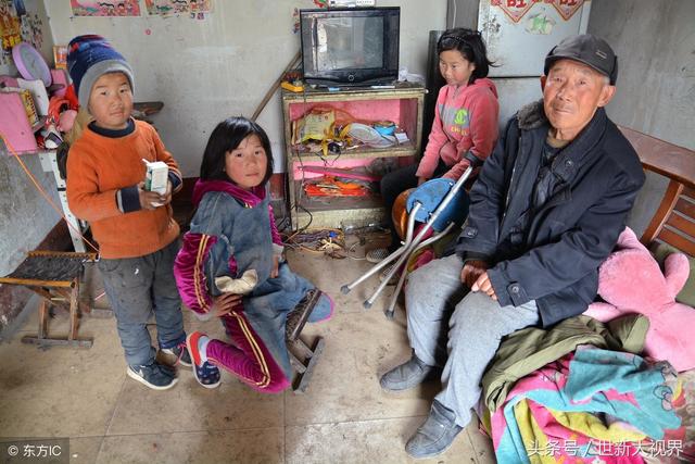 李星月是山东省日照市莒县店子集镇李家崮村人。旁边坐着的老人,是她的爷爷李战修。旁边是她的妹妹和弟弟。孩子多,家里也乱,而且当当荡荡,根本没有值钱的东西。(图片来自东方IC)