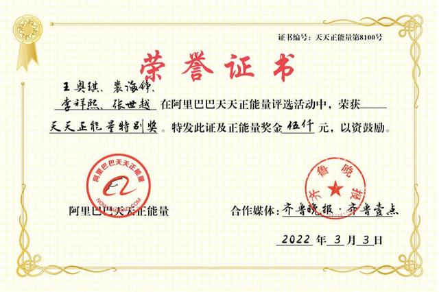 3月3日,在了解到李祥熙、王奥琪、裴海铮、张世越四人寻找离家出走少年的经历后,阿里巴巴天天正能量也联合齐鲁晚报·齐鲁壹点授予四人“天天正能量特别奖”,颁发证书并奖励四人正能量奖金5000元。