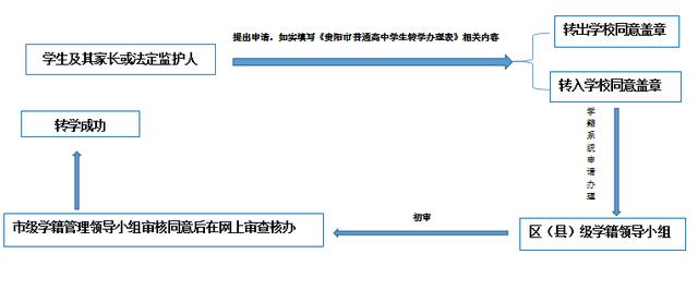 由学生及其家长或法定监护人提出申请,如实填写《贵阳市普通高中学生转学办理表》相关内容后经转出、转入学校同意盖章,由转入学校在学籍系统申请办理,县级初审后,经市级学籍管理领导小组审核同意后在网上审查核办。