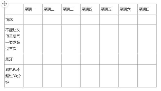 与孩子讨论,制定一个以周为单位的表格,并在表格中填写一系列必须完成的任务。如果孩子还没到识字的年龄,可用绘画或图片描述相应的任务。比如这样: